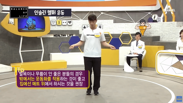 이 때 발목이나 무릎이 안좋으신 분들은 밖에서는 운동화를 착용하시고 집에서는 매트 위에서 하시는걸 권장한다고 합니다. 마찬가지로 1분 운동에 15초 휴식으로 3세트를 진행하시면 됩니다.