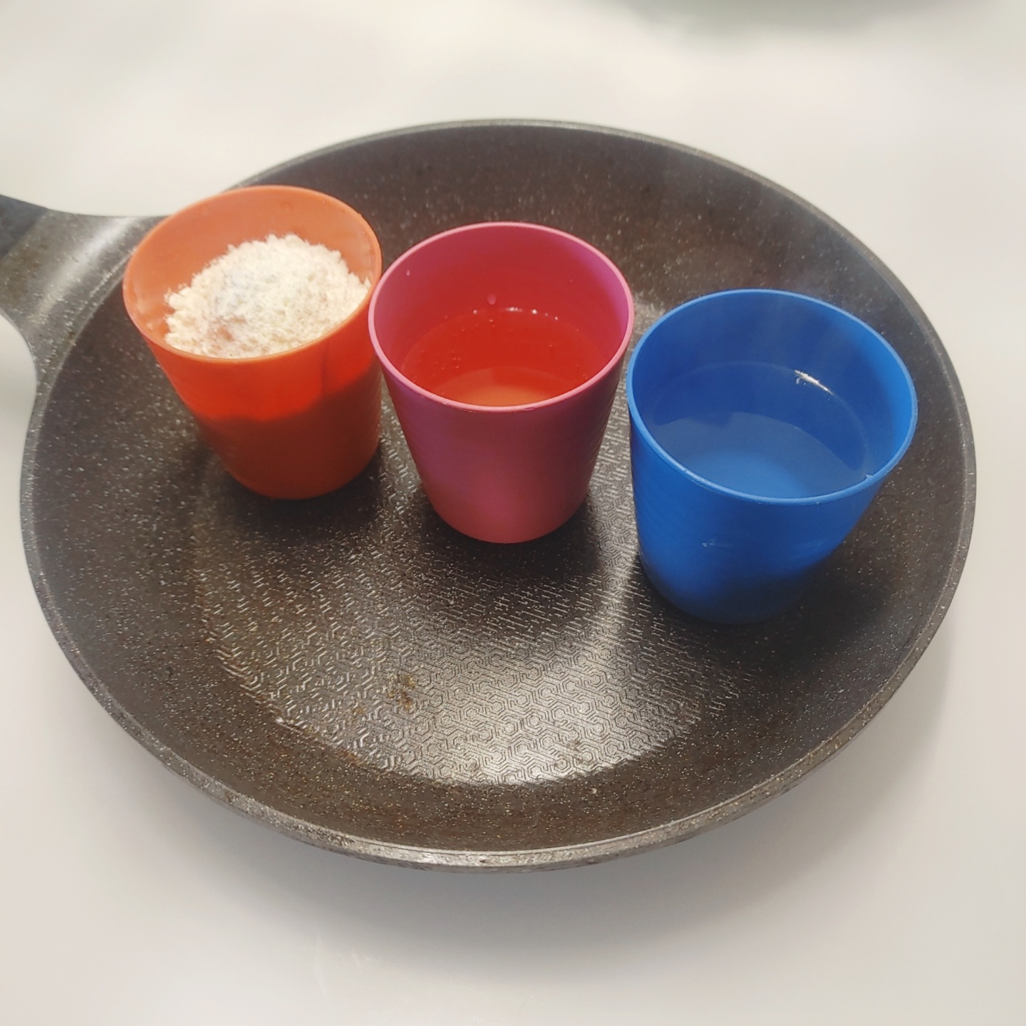 왼쪽부터 밀가루,식초, 뜨거운물이에요.